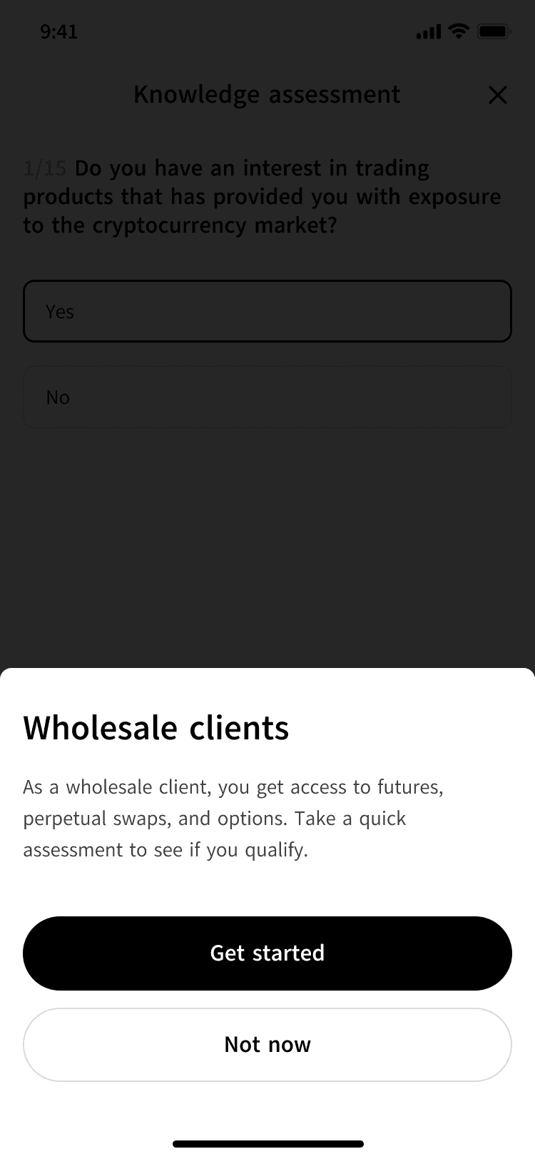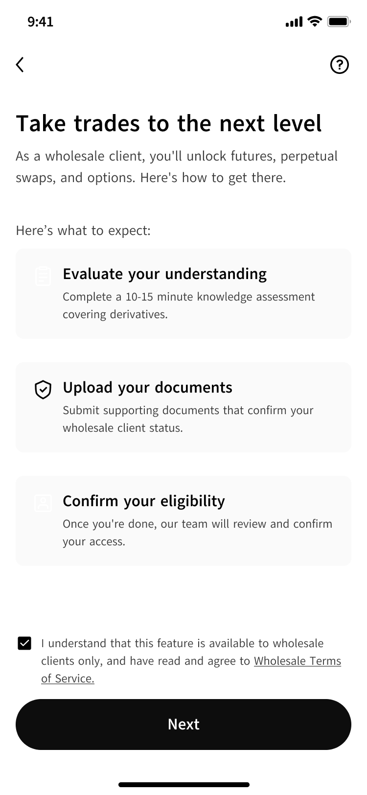 Derivatives trading opened up a new asset class for Australian wholesale users for the first time. I led the content strategy for the full onboarding experience, making a high-stakes, heavily regulated product feel approachable and clear.