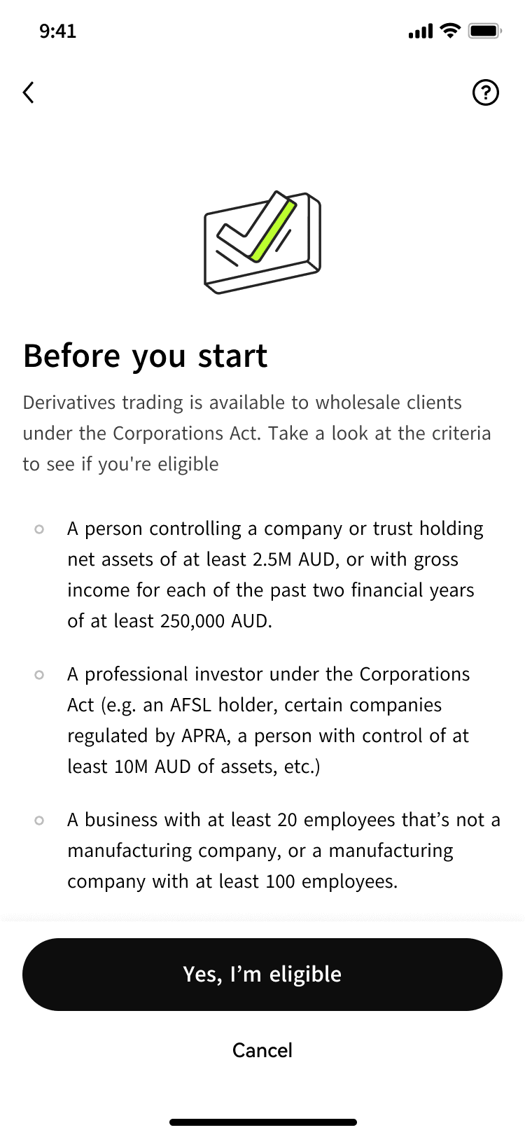 Help newly approved Australian users understand their eligibility, complete a two-step verification process, and place their first derivatives trade. Users should feel informed and confident at every step, without needing to contact support.